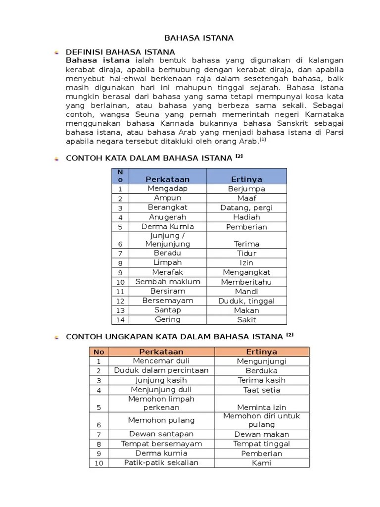 Bahasa istana maksud bahasa istana maksud almarhum allahyarham ampun kurnia maaf anugerah beri; Hadiah beradu tidur berangkat berlepas; Sultan negeri pahang akan berangkat ke tanah suci esok. Bahasa istana mungkin berasal daripada bahasa yang sama tetapi mempunyai kosa kata yang berlainan, atau bahasa yang berbeza sama sekali. Saya (merujuk kepada rakyat yang datang menghadap).
